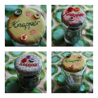 Taggit. Det fungerer bra - og disse kan brukes igjen og igjen. Du kan bruke det på alt slags tøy, men festepinsene lager hull så jeg har ikke hatt lyst til å bruke det til å merke tøy på den måten som er vist på bildet. Men på strikketøy er det flott!