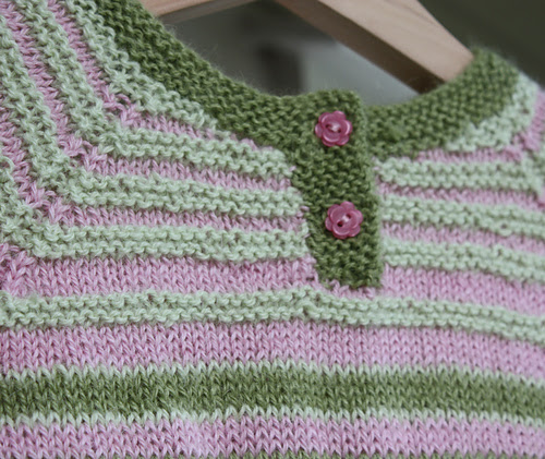 Genseren ble strikket i SandnesGarn Mini Alpakka, i lys grønn, oliven og lys rosa: Jeg hadde garnet liggende, ca 0,7 nøster av hver - der jeg fordelte striper etter mengden garn. For å få litt variasjon strikket jeg rillestrikk i lysegrønt garn øverst: Ferdig resultat veier 118 gram. Knappene er fra